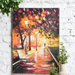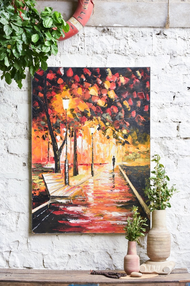 This impressionist-style painting captures a quiet evening stroll under a canopy of glowing autumn leaves. Golden street lamps light the path while their reflections shimmer across rain-kissed cobblestones. A lone figure in the distance adds a touch of solitude, inviting contemplation. The warm, fiery tones of amber, rust, and sienna evoke both nostalgia and peace, perfect for creating a soulful focal point in any space.