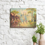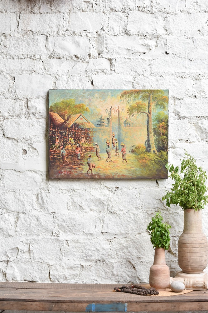 A tranquil homage to ritual and routine, Bali in Offering depicts a sacred procession under the morning sky. Women carry floral baskets atop their heads, moving gracefully toward the temple gates nestled between nature and thatched homes. The scene is bathed in warmth and stillness, echoing Bali's timeless devotion and harmony with nature. This hand-painted piece invites a sense of reverence, making it a soulful addition to any wall, a reminder of the beauty found in everyday grace.