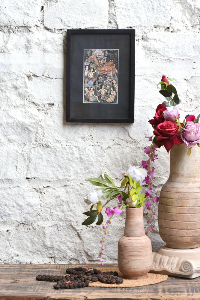 This captivating framed artwork is a vivid depiction of Balinese culture, alive with intricate characters, traditional dance forms, and mythical creatures. Rich in symbolism and folkloric energy, the artwork offers a glimpse into the vibrant rituals and festive spirit of the island. Framed in a sleek black mount, it beautifully contrasts the colorful detail within, making it a striking piece for collectors of heritage art or cultural narratives. Ideal for adding character to eclectic or global-inspired interiors.