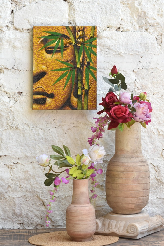 Bamboo Tranquility is a meditative portrayal of inner peace, where the gentle face of Buddha emerges from a golden backdrop, partially veiled by green bamboo stems. The artwork beautifully marries the serenity of spiritual presence with the organic calm of nature. The textured surface and vibrant contrast between yellow, green, and earthy tones evoke a sense of depth and stillness. Ideal for calming corners or zen-inspired spaces, this piece becomes a daily visual reminder to pause, breathe, and realign. It’s more than wall art, it’s a gateway to mindfulness.
