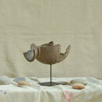 Bhinn is a quiet celebration of form shaped by time. Crafted from reclaimed wooden vessels that once held purpose in traditional kitchens, each sculpture bears the marks of age, worn edges, missing segments, and softened curves. Elevated on a slender iron stand, Bhinn invites reflection on impermanence, resilience, and quiet beauty. No two pieces are alike, making each one a soulful accent with a story to tell.