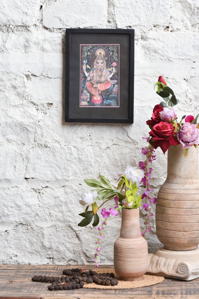 Invoke divine grace into your space with this intricately detailed framed art of Lord Ganesha, the remover of obstacles and harbinger of wisdom. The artwork exudes a serene energy, with vibrant hues and delicate textures capturing every sacred symbol and ornament. Set against a deep black mount and housed in a clean black frame, this piece is perfect for home altars, meditation corners, or sacred spaces. A timeless reminder of spiritual strength and new beginnings.