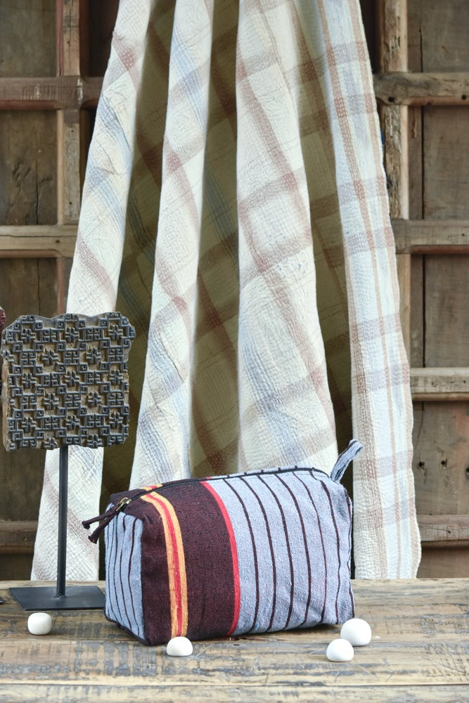 These upcycled fabric pouches are more than just utility, they’re a story of revival and resilience. Made from handwoven rugs crafted out of discarded garments, the fabrics are first sorted by colour, spun into yarn, and then woven into striking striped textiles. Each pouch is lovingly handcrafted in remote villages, where this traditional weaving remains a vital source of livelihood. Durable, vibrant, and rich in purpose, these pouches celebrate sustainability while supporting dignified employment. Ideal for storing toiletries, travel essentials, or gifting with intention.