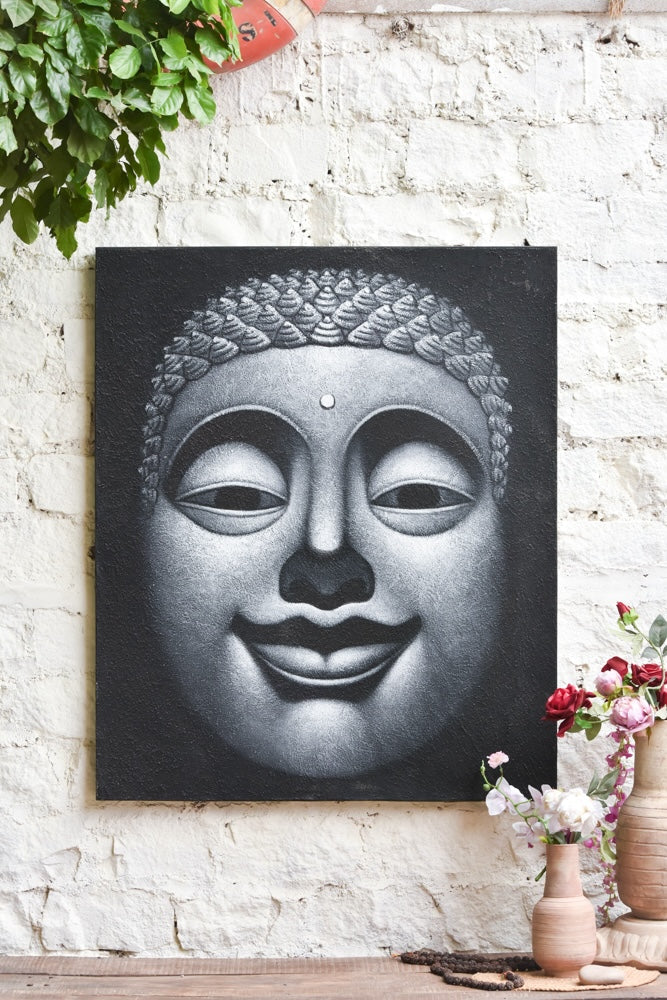 A serene portrait of Lord Buddha, this monochromatic artwork emanates peace and calm through its soft curves and meditative expression. The fine detailing on the curls and the radiant third-eye highlight divine wisdom, while the gentle smile reflects inner harmony. Set against a bold black backdrop, this piece invites stillness into any space, a perfect companion for your meditation corner or a soulful nook at home.