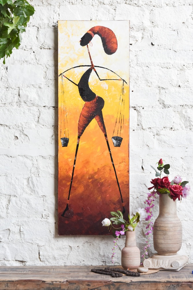 A striking tribute to the strength and elegance of tribal women, this artwork captures the rhythmic movement of a water carrier in silhouette. The elongated limbs, vibrant posture, and earthy palette of ochre, amber, and rust speak of resilience and rhythm in daily life. The abstract form and textured finish give it a modern tribal appeal, making it a bold and soulful statement for any wall.