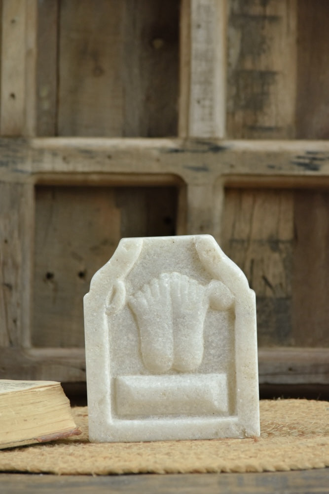 This handcrafted marble plaque depicts sacred footprints, a symbol of reverence, humility, and devotion in many traditions. Known as Charan Paduka in Indian culture, such imprints embody the blessings of divine presence, reminding us to walk with grace, gratitude, and mindfulness. Carved from natural marble, the piece radiates simplicity and purity, making it an inspiring addition to a meditation corner, temple space, or as a soulful accent in your home.