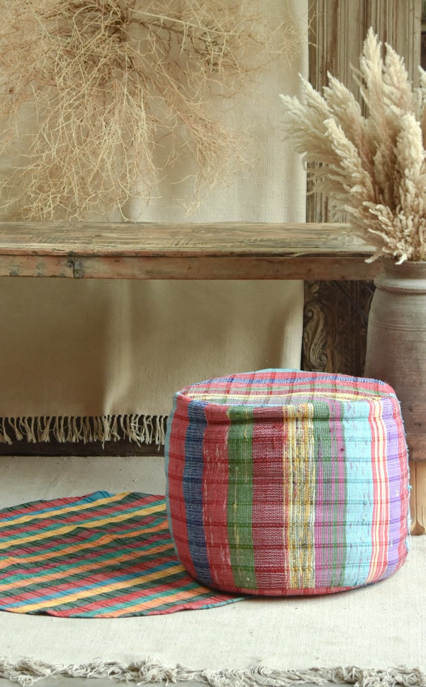 Infuse your space with playful charm and conscious living through this vibrant Chindi pouffe and rug set. Handwoven from upcycled fabric scraps, each piece showcases bold stripes and joyful colors that add warmth, texture, and personality to any room.The round pouffe offers versatile use as a footrest, casual seating, or a statement accent—while the coordinating rug grounds the space with rustic comfort. Made by artisans in rural communities, each set supports sustainable practices and preserves traditional weaving techniques.No two sets are exactly alike each is a unique fusion of reuse, heritage, and vibrant design.