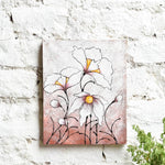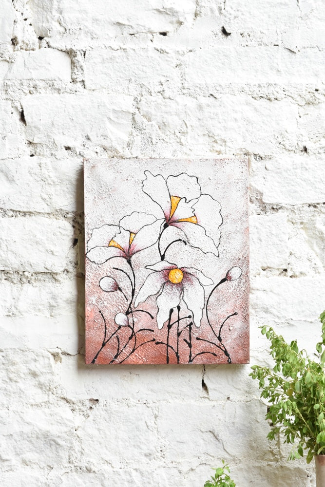 Whispers in White” is a poetic rendering of purity and resilience. The white petals dance over an earthy canvas, glowing from within with warm amber hues. The piece carries a serene, meditative energy, like a quiet field at sunrise.