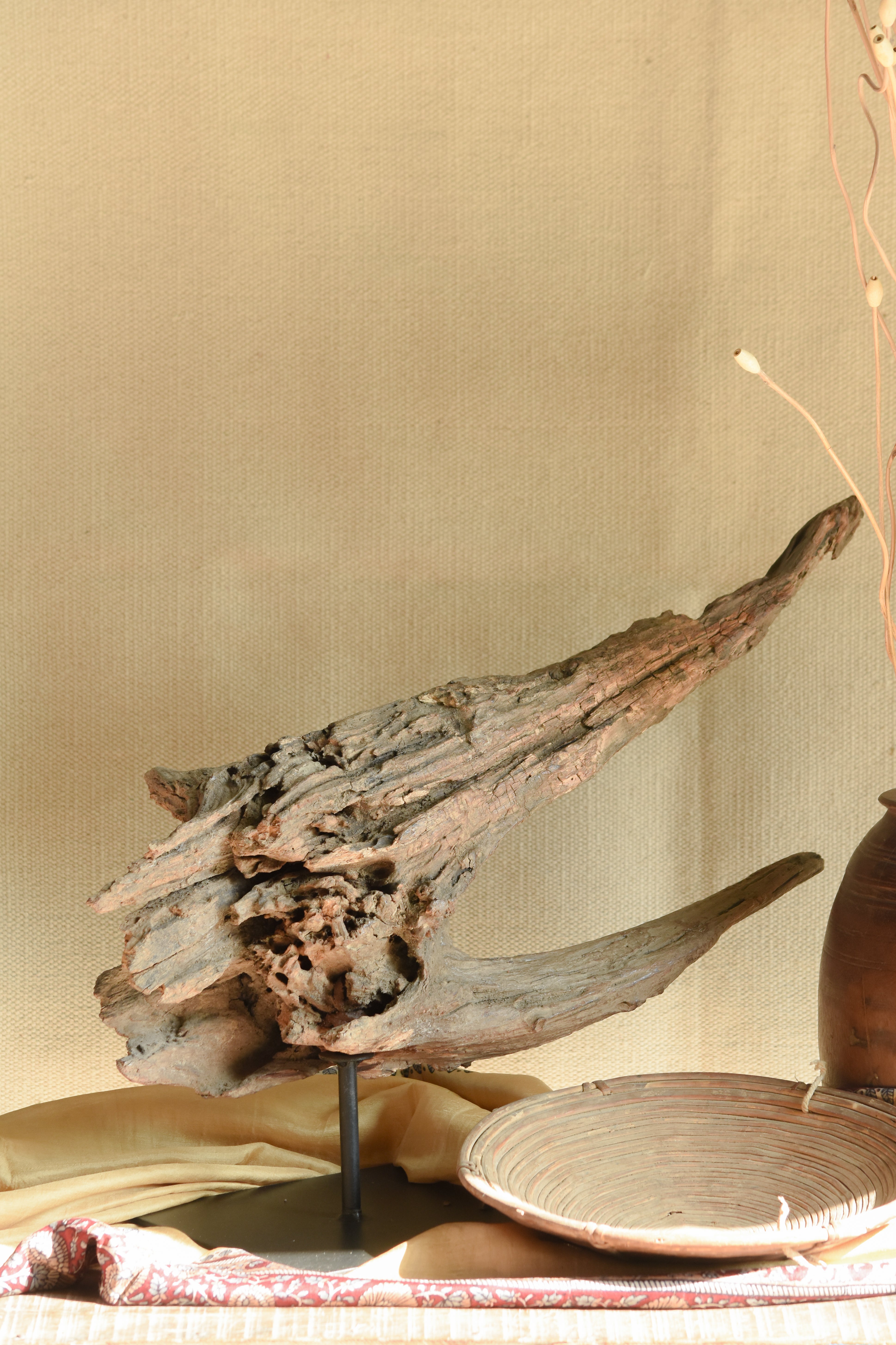 Ekaurr Driftwood Sculpture on Metal Stand – raw weathered driftwood with organic contours and earth-toned patina, gallery-worthy natural art piece
