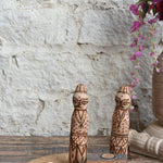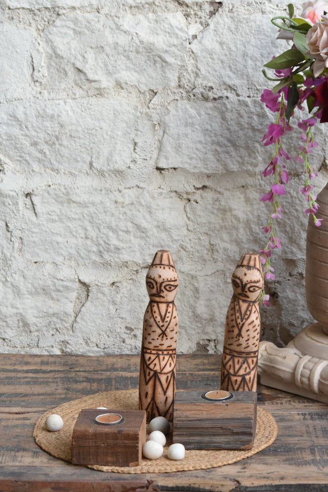 Set of 2 Burnt Wood Etching Decorative Dolls – Unique handcrafted wooden dolls made using burnt wood etching, showcasing intricate rustic artistry. (3x3x11.5 inches)