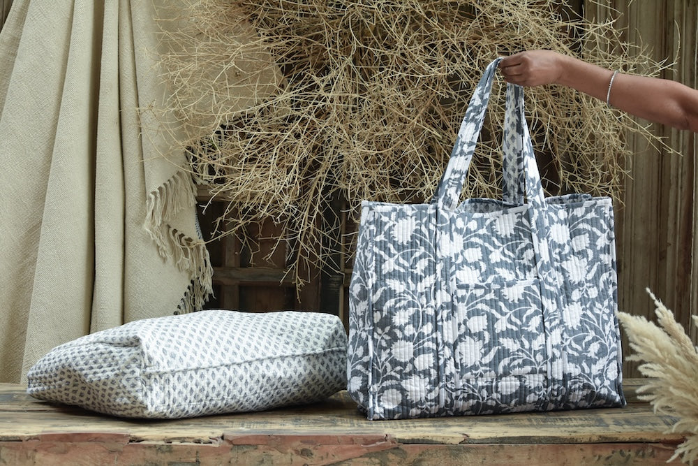 Elevate your everyday carry with this handcrafted block-printed cotton tote, quilted for added durability and charm.