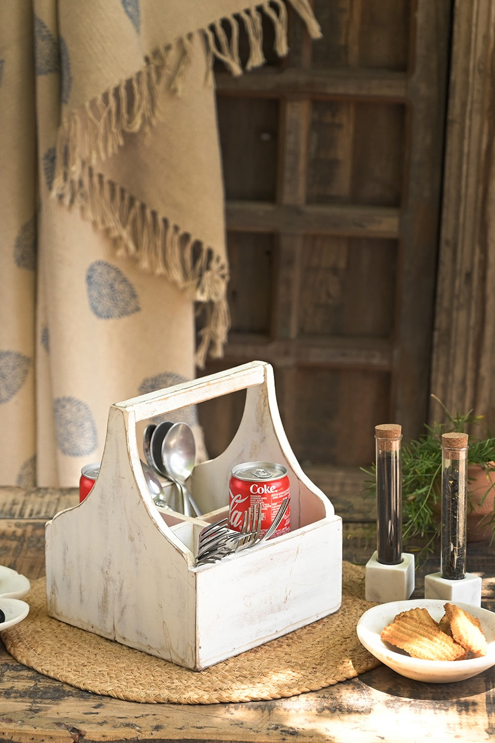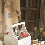 Elevate your dining experience with this handcrafted 4-section cutlery holder, made from reclaimed wood in a beautifully muted white tone. Designed for both functionality and visual appeal, it helps keep your tableware organized while adding a rustic, artisanal charm to your tablescape. Perfect for daily use or special gatherings, it brings character and warmth to any setting.