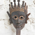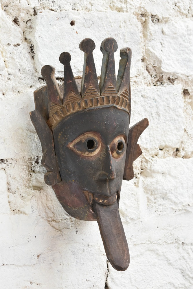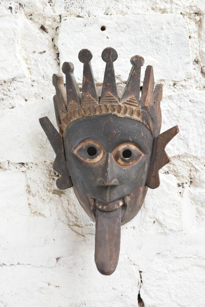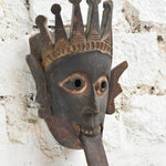 This fierce and bold tribal wall mask, with its tongue playfully extended, evokes the raw energy and power of indigenous art. Crowned and carved with dramatic edges, it carries the essence of protection, warding off negativity from the spaces it adorns. Each detail is hand-chiselled from reclaimed wood, preserving the primal spirit and storytelling of the artisan’s vision. The dark finish and expressive features make it a powerful statement for eclectic walls or entryways. It's a conversation starter rooted in folklore, defiance, and ancestral pride.