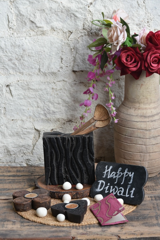 Set of 2 Print Block Tea Light Holders (4.5 x 4.5 x 1 in, One-of-a-Kind) – Repurposed from vintage print blocks, each holder carries distinct motifs, adding artisanal charm to festive evenings.