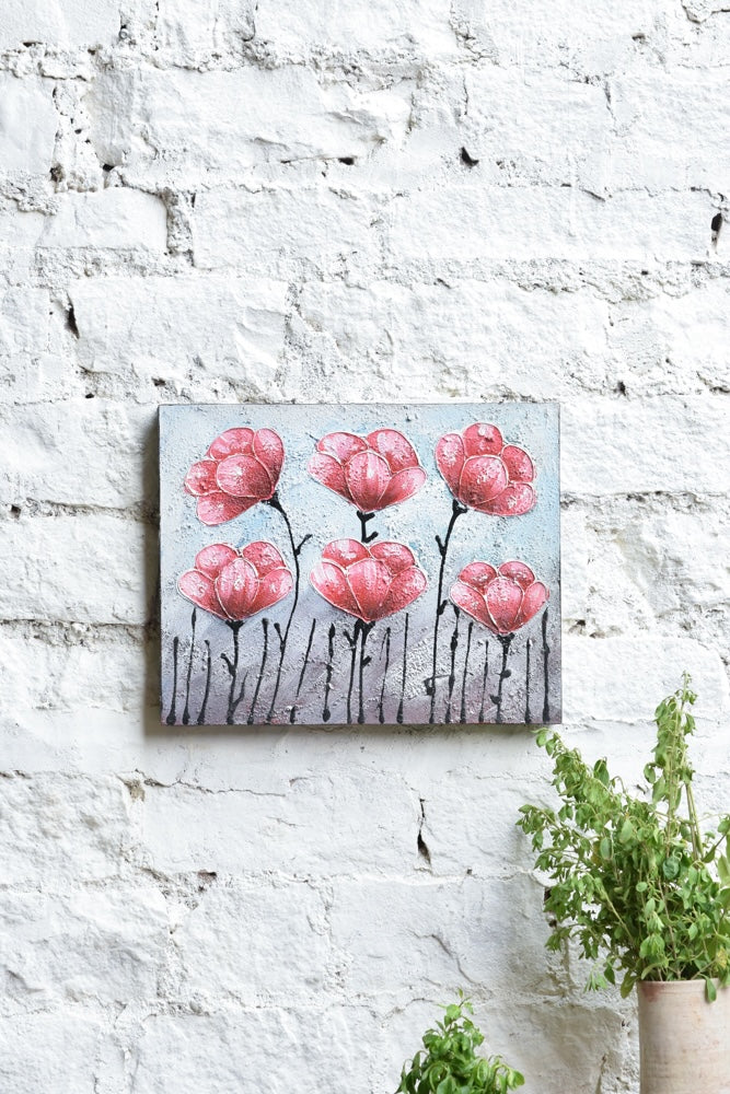 A gentle cluster of pink blossoms rises delicately from a textured canvas, capturing the fleeting beauty of spring in bloom. “Blush Bloom” evokes softness, femininity, and the joyful simplicity of nature. Perfect for uplifting small corners, this artwork carries a subtle charm and handcrafted feel.