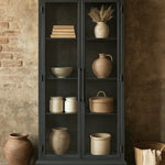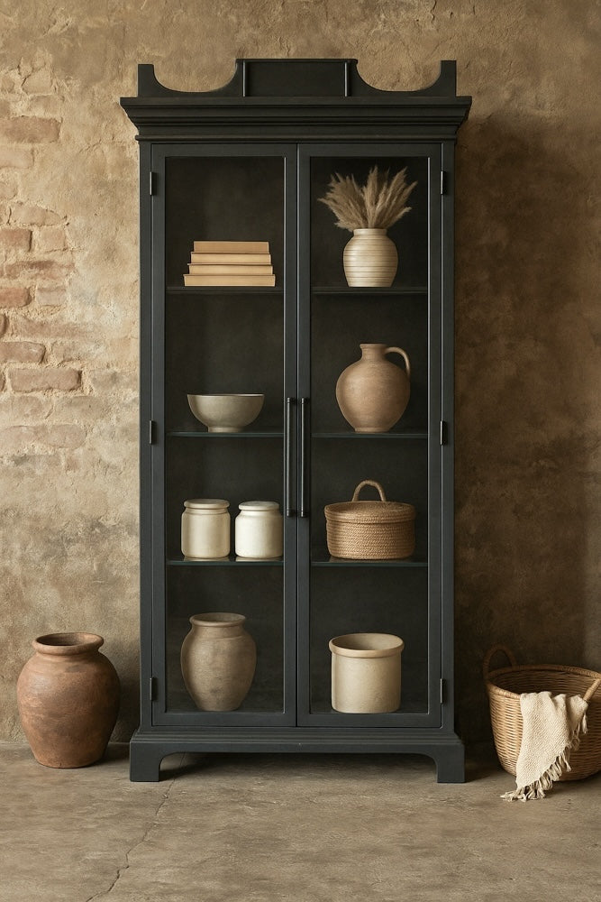 This tall black-finished almirah is a striking blend of industrial charm and timeless elegance. Crafted in metal with a matte finish, it features transparent glass doors that reveal spacious interiors. The clear glass shelves inside lend a modern touch while allowing for open, airy styling. Perfect for showcasing collectibles, books, or tableware, it elevates any space with understated sophistication. The gently curved crown adds a refined architectural detail. Its versatile design fits beautifully in rustic, contemporary, or eclectic interiors. A statement piece that balances utility and artistry effortlessly.