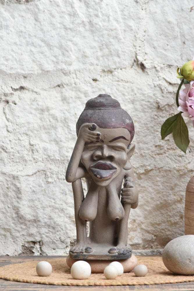 This handcrafted figurine captures a moment of quiet introspection, embodying the beauty of stillness and thought. With its expressive posture and subtle detailing, the piece reflects a contemplative state, reminding us to pause, reflect, and listen inward. The earthy tones, gentle textures, and slightly weathered finish add depth and character, making it feel soulful and timeless. Whether placed on a shelf, console, or meditation corner, this sculpture brings a calm, reflective presence and serves as a gentle reminder of mindfulness in everyday life.
