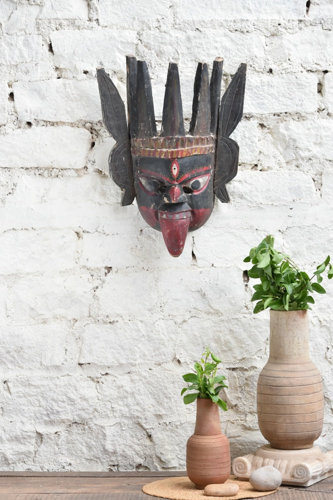With flared eyes, a glaring third eye, and a protruding red tongue, this hand-carved wooden mask channels the raw energy of Raudra the fierce and protective aspect found in many indigenous and divine traditions across India. Painted in deep shades of black and red with symbolic leaf-like ears and a spiked crown, this piece evokes the power of goddess Kali and tribal guardian spirits. Crafted using aged wood and natural pigments, it stands as a bold statement of divine rage, energy, and protection against evil.