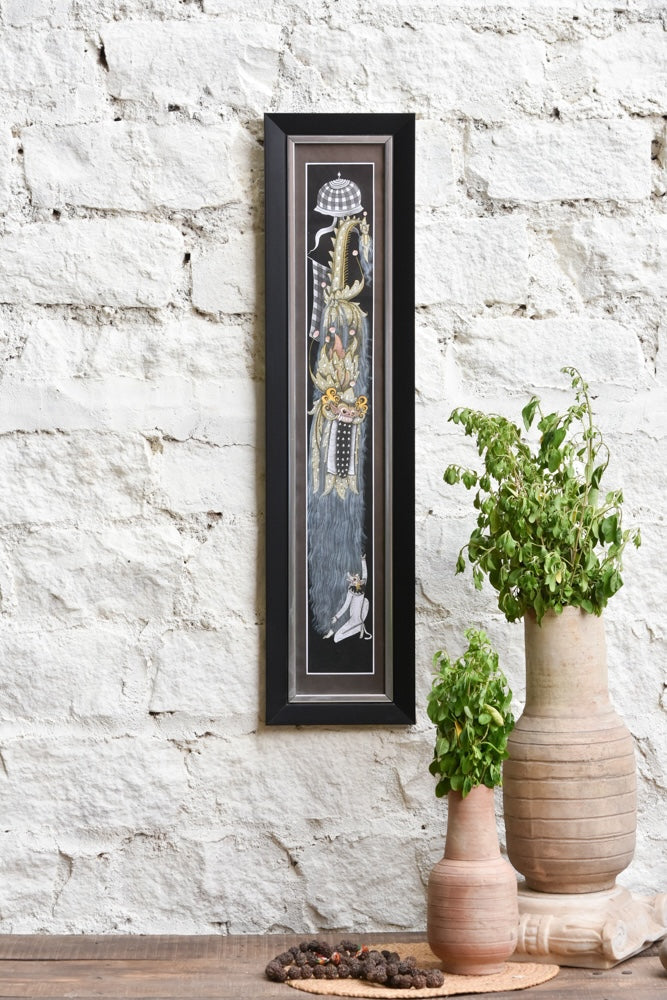 This frame showcases a reverent interaction between the mythic Barong and a humble devotee, expressing the sacred bond between protector and follower. Flowing manes, delicate florals, and the stylized mask details are meticulously hand-painted, celebrating Bali’s rich spiritual heritage. The composition invites contemplation, making it a captivating piece for spaces meant for grounding and grace.