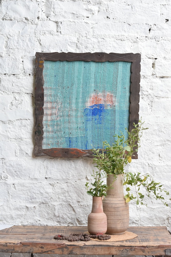 Each Kantha wall art in this collection is a rare treasure, crafted from the most intricate, labor-intensive stitching styles. Every fabric is one-of-a-kind, showcasing the highest level of skill passed down through generations of artisans. This isn't just textile frames, it's a canvas of tradition, texture, and time, woven with care and emotion. Framed in handcrafted wooden silhouettes, the frame shape is also made from vintage wooden strips, each having a unique pattern. The subtle irregularities in threadwork and fabric tones only add to its soulful charm. Whether hung solo or styled as a series, it brings depth, warmth, and heritage to your walls. Let the piece choose you, or feel free to request images to pick your own masterpiece.
