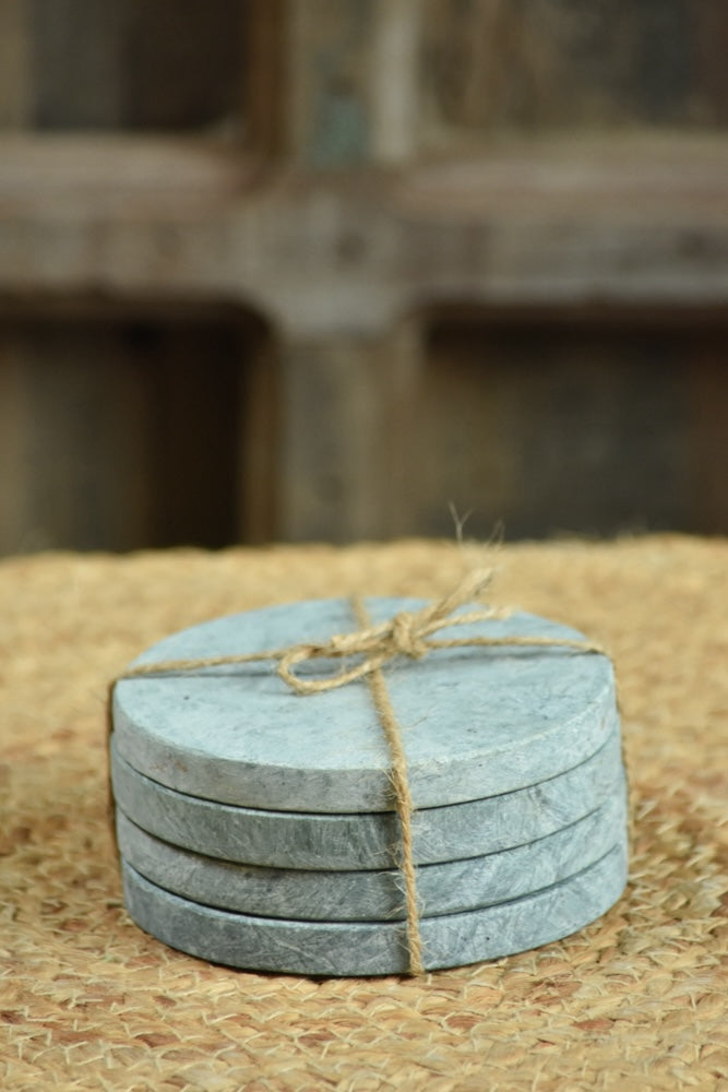 Handcrafted from solid marble, these round coasters embody simplicity and timeless charm. The natural veining and cool tones bring an understated elegance to your table, making it versatile for everyday use or special gatherings. Whether paired with a rustic wooden table or a modern glass surface, their minimalist form ensures they blend seamlessly while protecting your furniture from stains and rings. Bound with a rustic jute tie, this set of four is equally practical and gift-worthy.