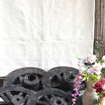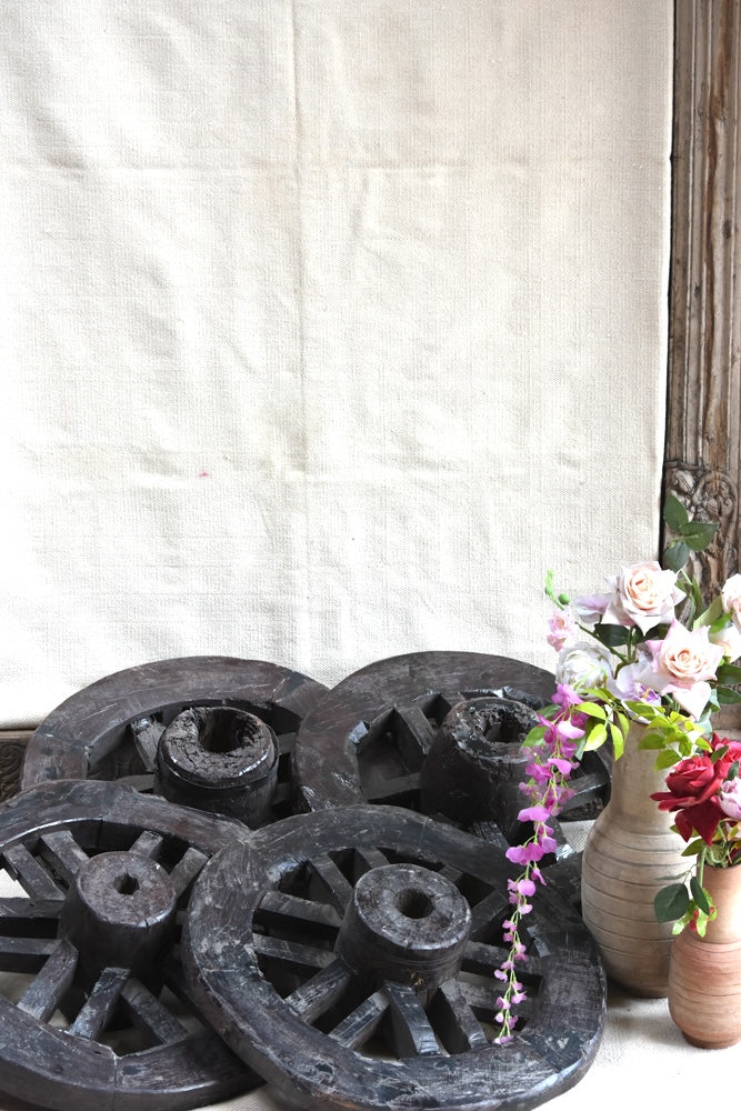 Once turning across dusty roads and rugged village paths, these hand-carved wooden wheels carry the memory of journeys long past. Their darkened grain and worn edges speak of countless revolutions, of carts heavy with grain, fabrics, or families on pilgrimage. In many traditions, wheels symbolize continuity, progress, and the eternal cycle of life. These vintage pieces, preserved in their raw patina, transform from objects of motion into anchors of stillness reminders of how far we have come, and of the enduring strength of craft. Each wheel bears the marks of time: cracks, weathering, and the unmistakable presence of human hands that shaped and used them. Today, they live on as sculptural décor rustic, bold, and deeply rooted in heritage. Whether leaned against a wall or displayed as a centerpiece, they bring into your home the poetry of movement and memory.