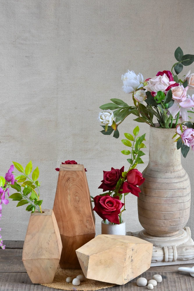 Carved from solid reclaimed wood, these abstract pieces play with angles, planes, and raw textures each facet revealing the natural grain and character of the timber. Minimalist yet grounded, they embody the beauty of geometry born from nature’s canvas. Neither vase nor vessel, these sculptures exist simply as art to be placed on a console, a coffee table, or a shelf where their quiet strength and sculptural presence can speak. Each piece is unique, celebrating the individuality of the wood and the vision of the artisan’s hand. The Faceted Form Sculptures invite reflection: objects that need no function to justify their being, only space to remind us that beauty can be found in simplicity, material, and form.