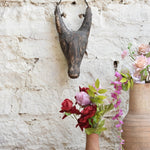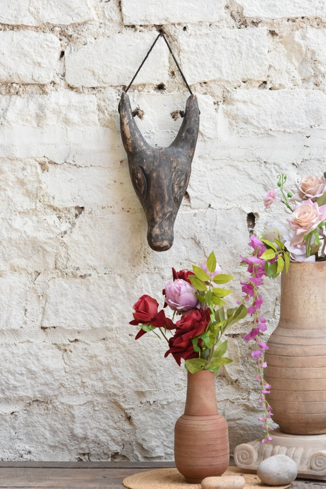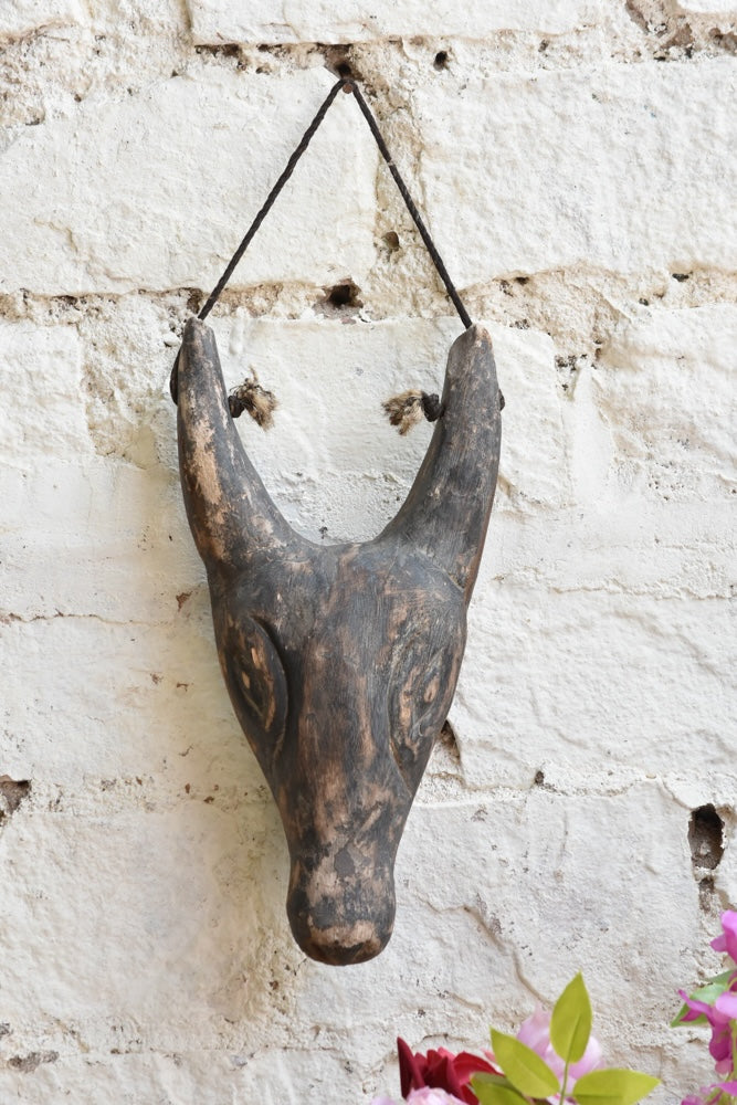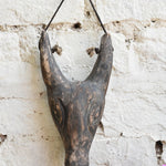 With tall, crescent-like horns arching upward and deep-set eyes carved into aged wood, this mask embodies the spirit of the sentinel, steady, watchful, and protective. Its darkened surface bears the marks of time and ritual, echoing the resilience of ancestral traditions that saw such figures as guardians of threshold and field. In many tribal cultures, horned masks symbolized strength and vigilance, channelling the raw energy of wild animals into forms that shielded the community. The elongated snout and pared-down features speak of simplicity, yet they hold a quiet power: a reminder of the bond between humans and the beasts they revered. Carved by hand and finished in rustic, weather-worn tones, this mask stands as a relic of guardianship. Hung upon a wall, it evokes the presence of watchful spirits, lending strength and a protective aura to the space it inhabits.