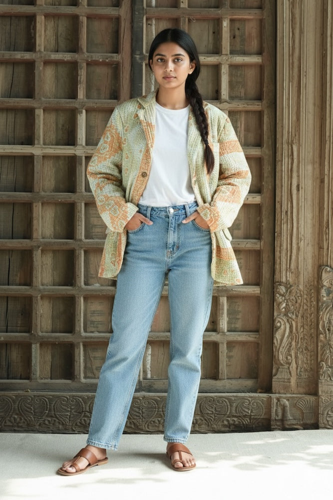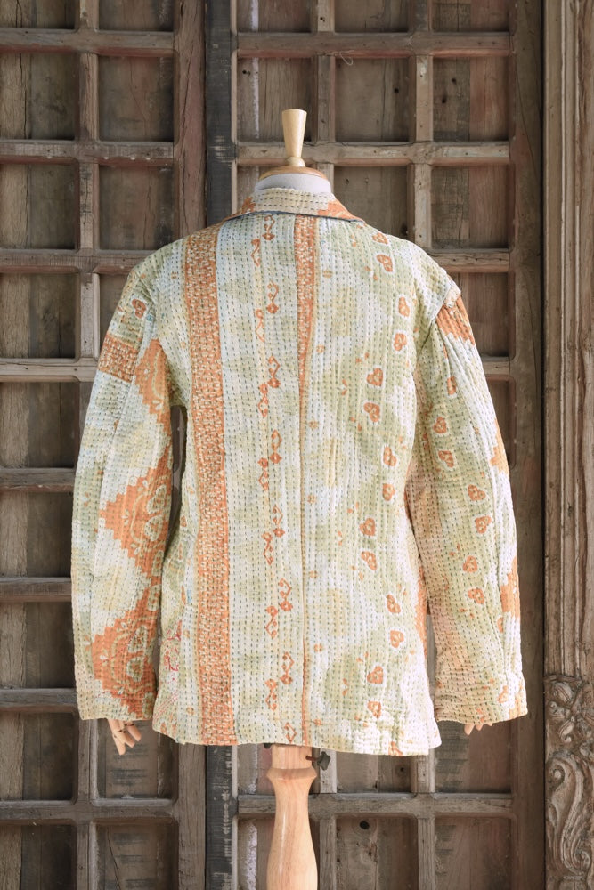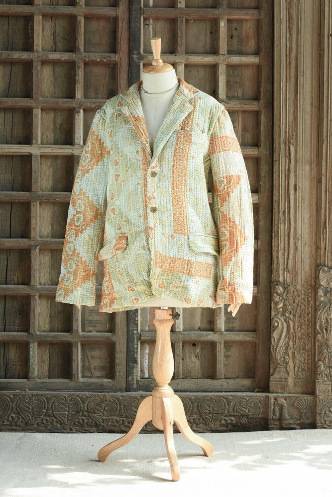 Vintage hand-embroidered kantha blazer. Made for anyone and everyone, this versatile and stylish piece complements any look. At Ekaurr, we embrace the art of upcycling, transforming vintage materials into unique, one-of-a-kind creations.