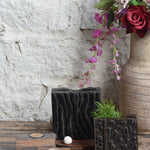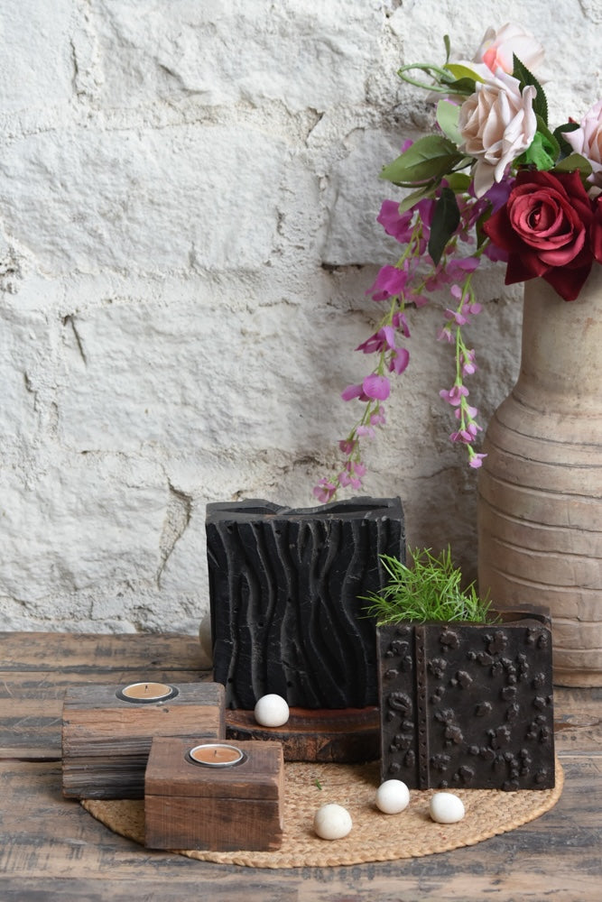 Set of 2 Print Block Planters (4-6 inches, One-of-a-Kind) – Handcrafted from vintage wooden print blocks, each planter is unique in motif and texture, ideal for styling plants or as a rustic desk accent.