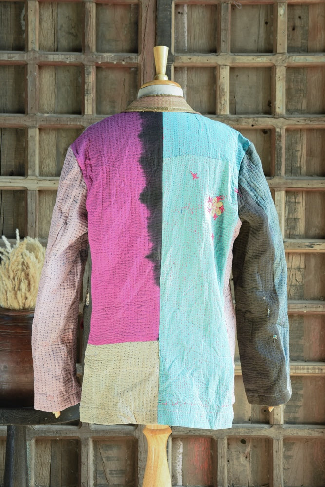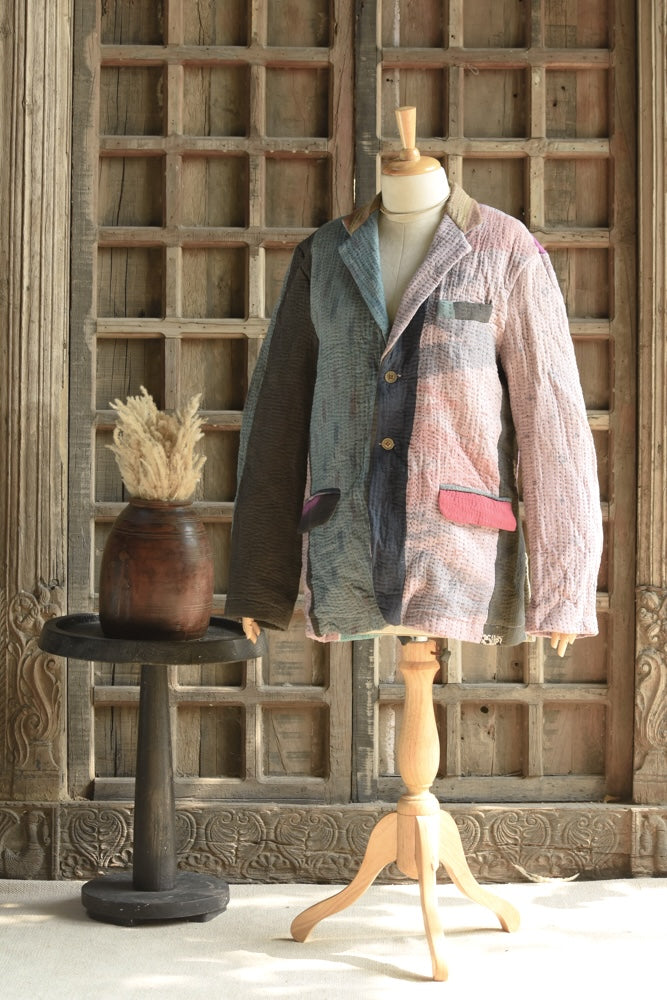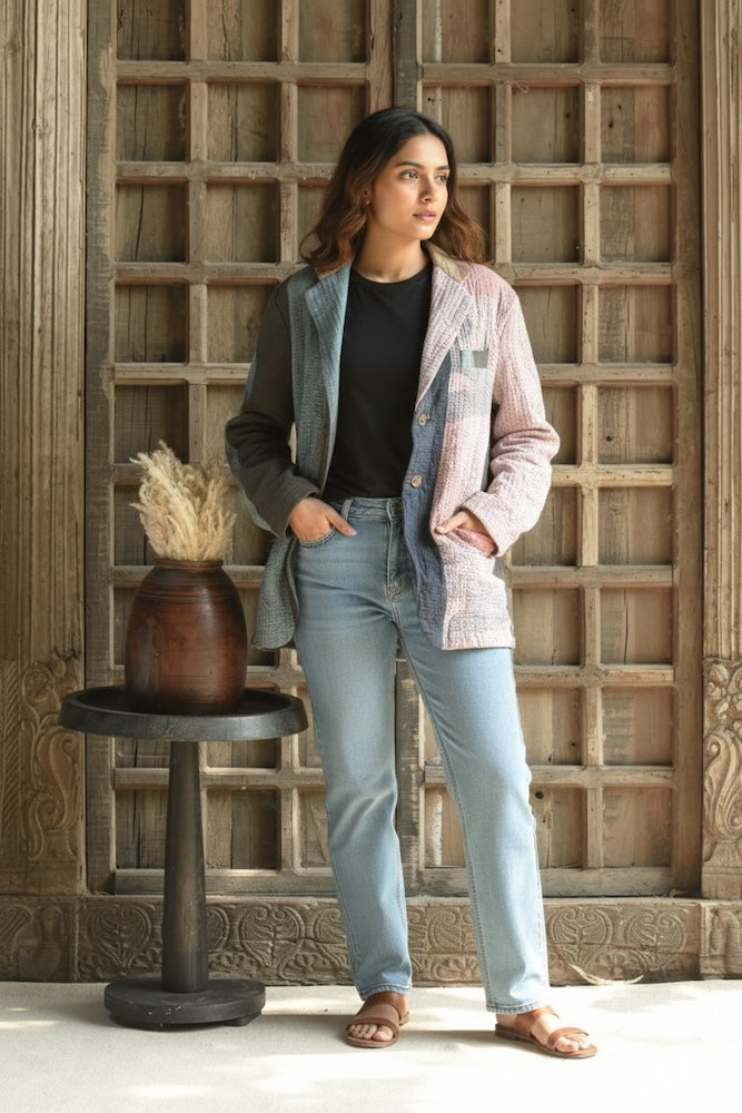 Vintage hand-embroidered kantha blazer. Made for anyone and everyone, this versatile and stylish piece complements any look. At Ekaurr, we embrace the art of upcycling, transforming vintage materials into unique, one-of-a-kind creations.
