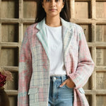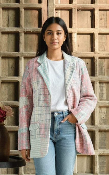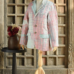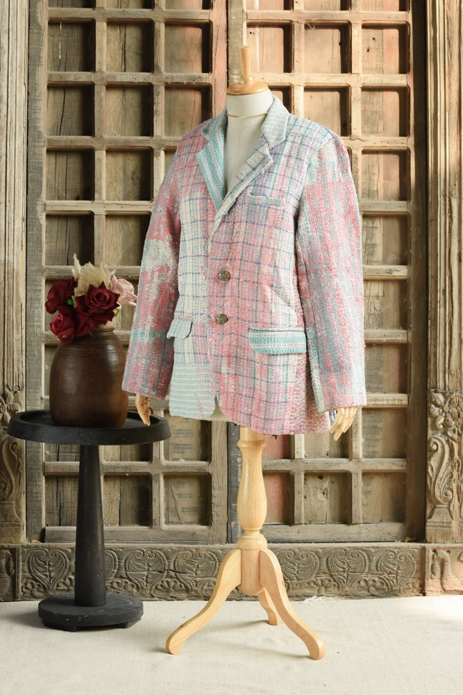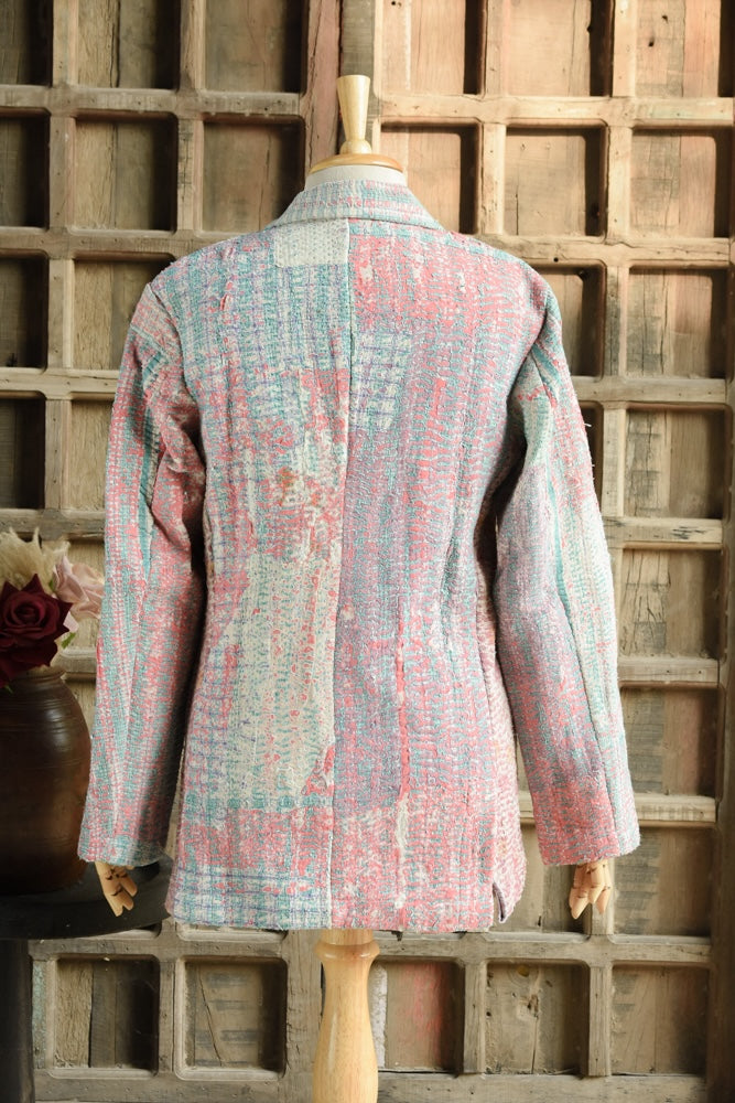 Vintage hand-embroidered kantha blazer. Made for anyone and everyone, this versatile and stylish piece complements any look. At Ekaurr, we embrace the art of upcycling, transforming vintage materials into unique, one-of-a-kind creations.