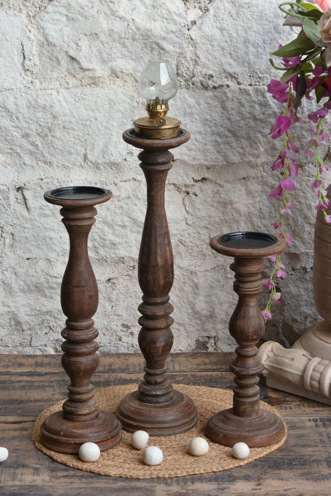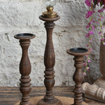 This set of three tall vintage candle holders brings old-world charm into modern spaces. Once crafted with care to hold the soft glow of candlelight, they now stand as elegant décor pieces that celebrate both function and form. Their aged finish and graceful height create a sense of drama and warmth perfect for festive evenings, dining tables, or quiet corners that crave a touch of light. Each piece carries the marks of time, making it not just a candle holder, but a story of evenings past, now ready to illuminate new moments. Together, they form a trio that transforms spaces with depth, character, and a gentle glow. (Small - 5 x 5 x 11.25in, medium - 5 x 5 x 15.5in, large - 5 x 5 x 18.5in)