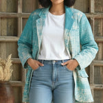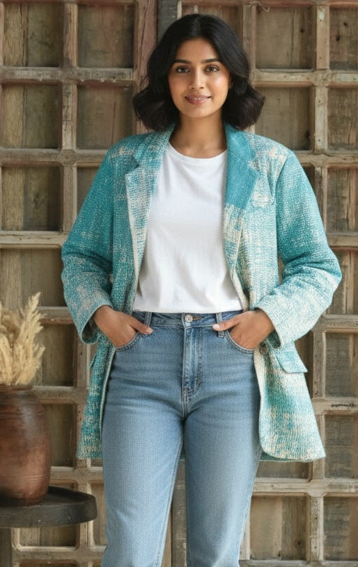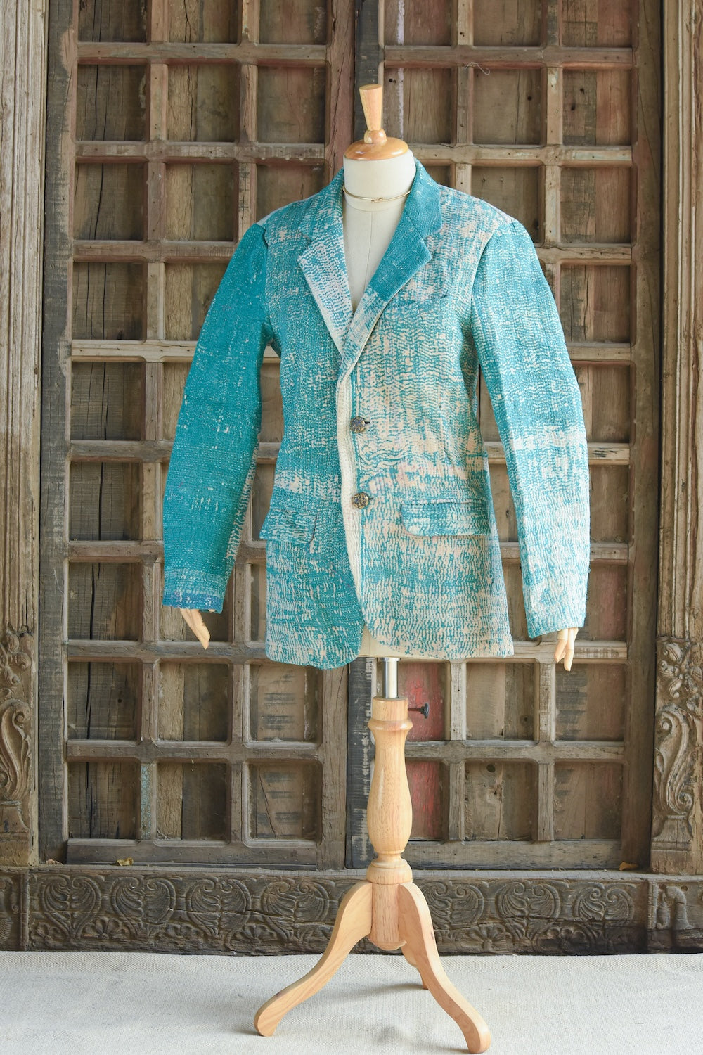 Vintage hand-embroidered kantha blazer. Made for anyone and every one, this versatile and stylish piece complements any look. At Ekaurr, we embrace the art of upcycling, transforming vintage materials into unique, one-of-a-kind creations. Variations in print and colour may exist.
