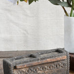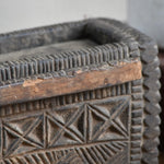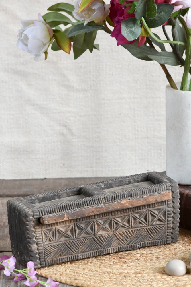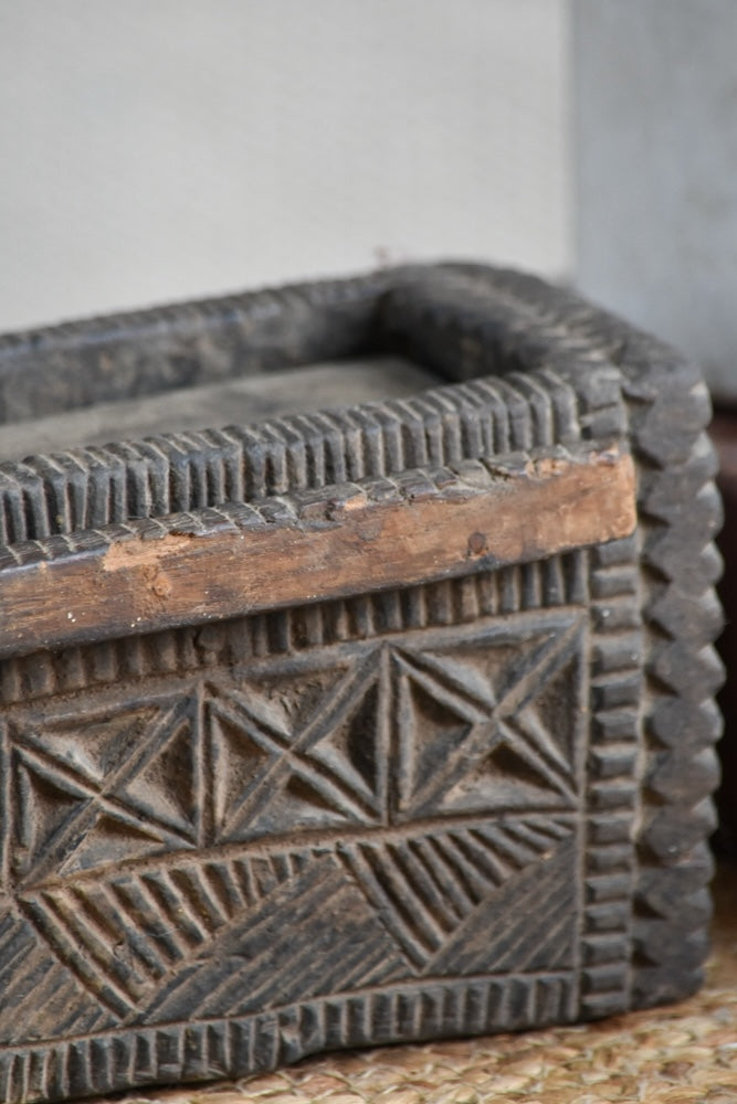 Hand-carved with bold geometric motifs and rhythmic patterns, this vintage wooden box once held small treasures, spices, or ritual objects in tribal households. Its textured edges and linear designs reflect the artisan’s instinctive skill, a language of patterns passed down through generations. The dark patina and worn corners speak of years of use, turning this box into both a functional object and a cultural artifact. What was once utilitarian has now become sculptural, a reminder of the lives and hands it passed through. Reimagined as décor, the Tribal Keepsake Box stands as more than storage. It is a fragment of heritage, a piece that holds not only objects but also memory, tradition, and story.