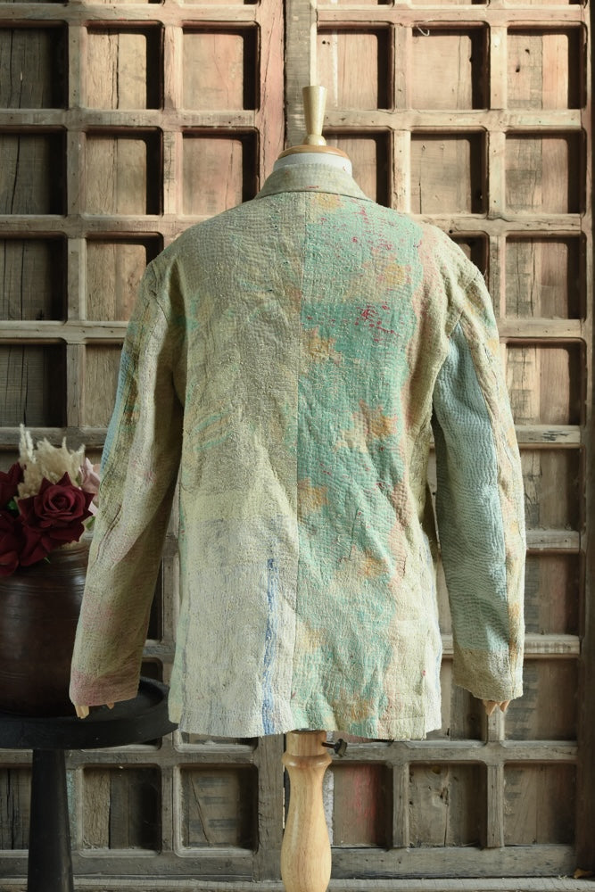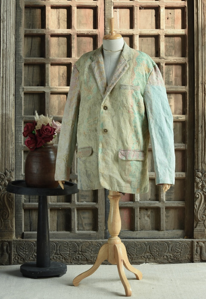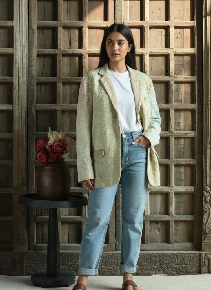 Vintage hand-embroidered kantha blazer. Made for anyone and everyone, this versatile and stylish piece complements any look. At Ekaurr, we embrace the art of upcycling, transforming vintage materials into unique, one-of-a-kind creations.