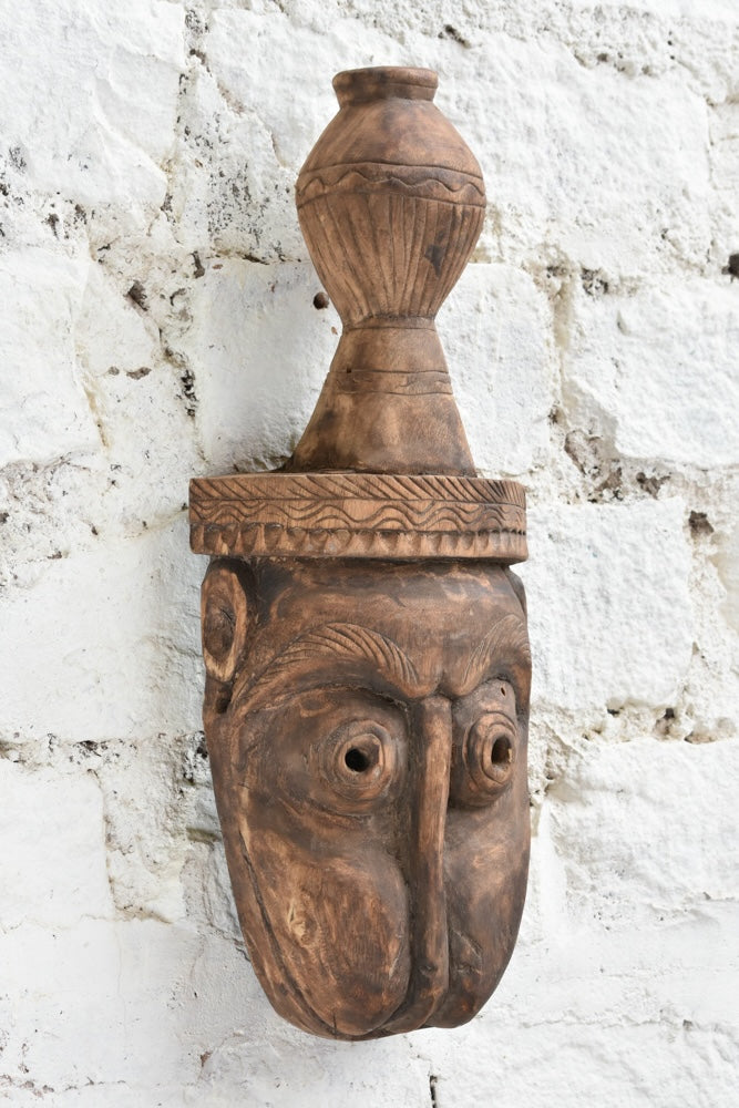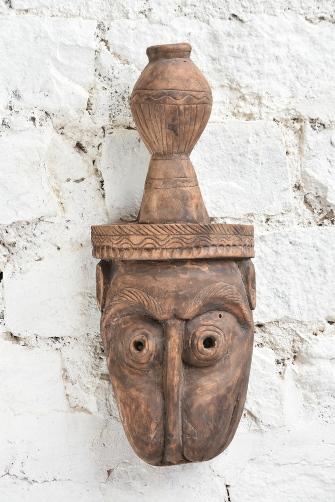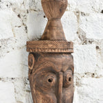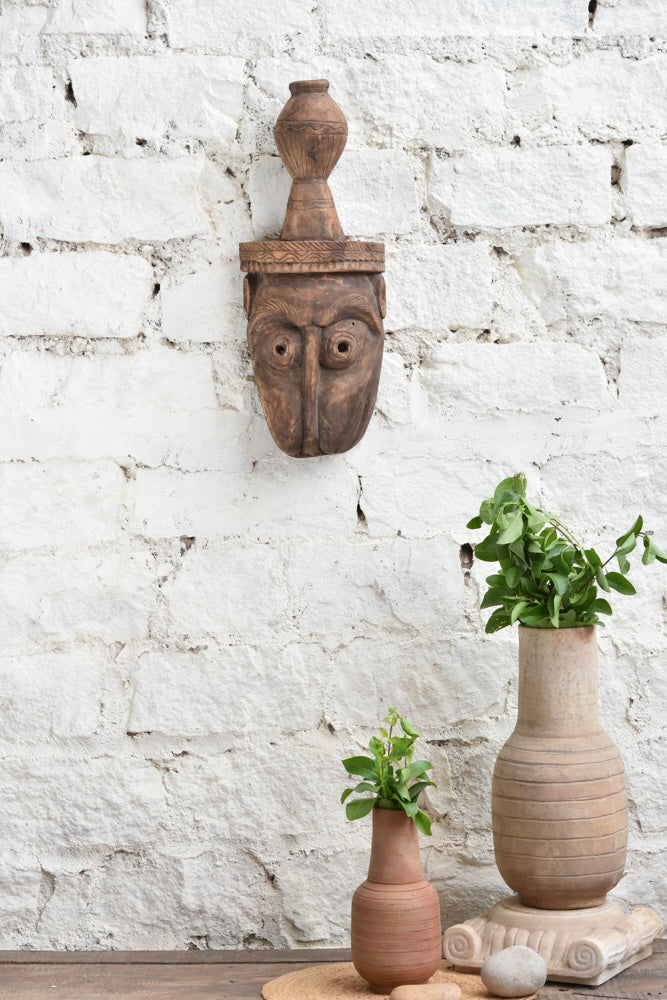An ode to the humble yet powerful symbolism of the water vessel, this tribal mask features a sculpted matka (pot) rising from the head echoing the enduring image of village women balancing pots as they carry life-giving water. The face is wide-eyed, alert, and grounded, expressing resilience and quiet observation. Hand-carved from salvaged wood with a raw, rustic finish, this piece captures a poetic blend of daily labor and divine strength in rural tradition.