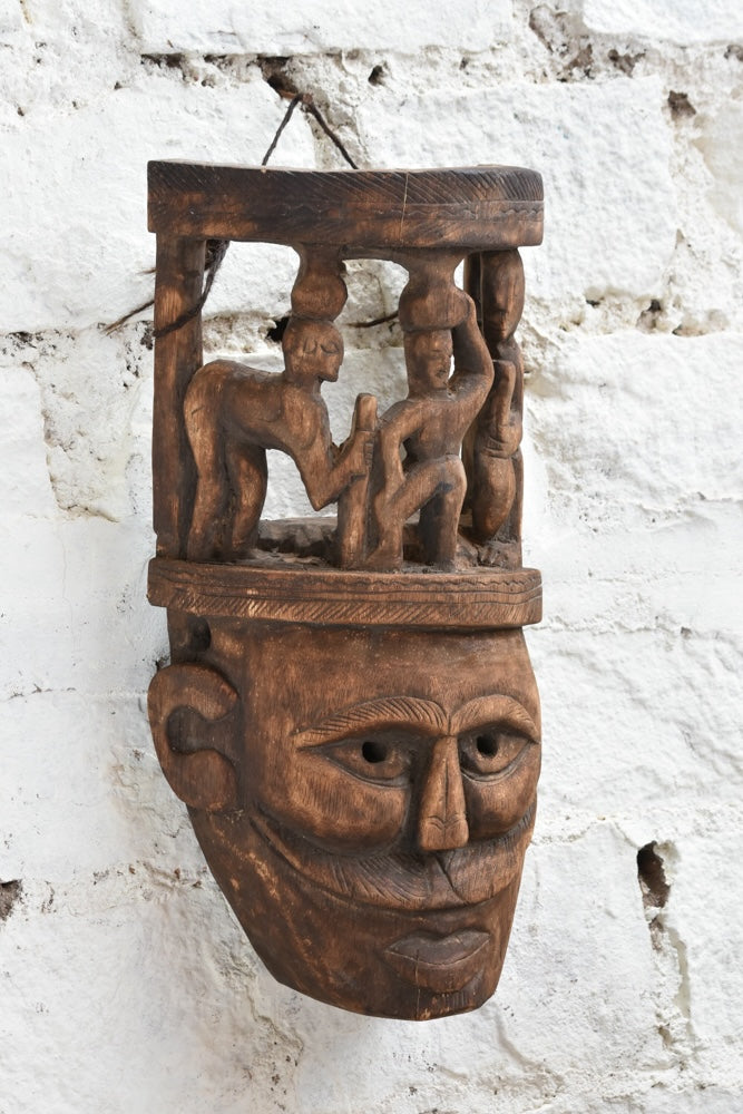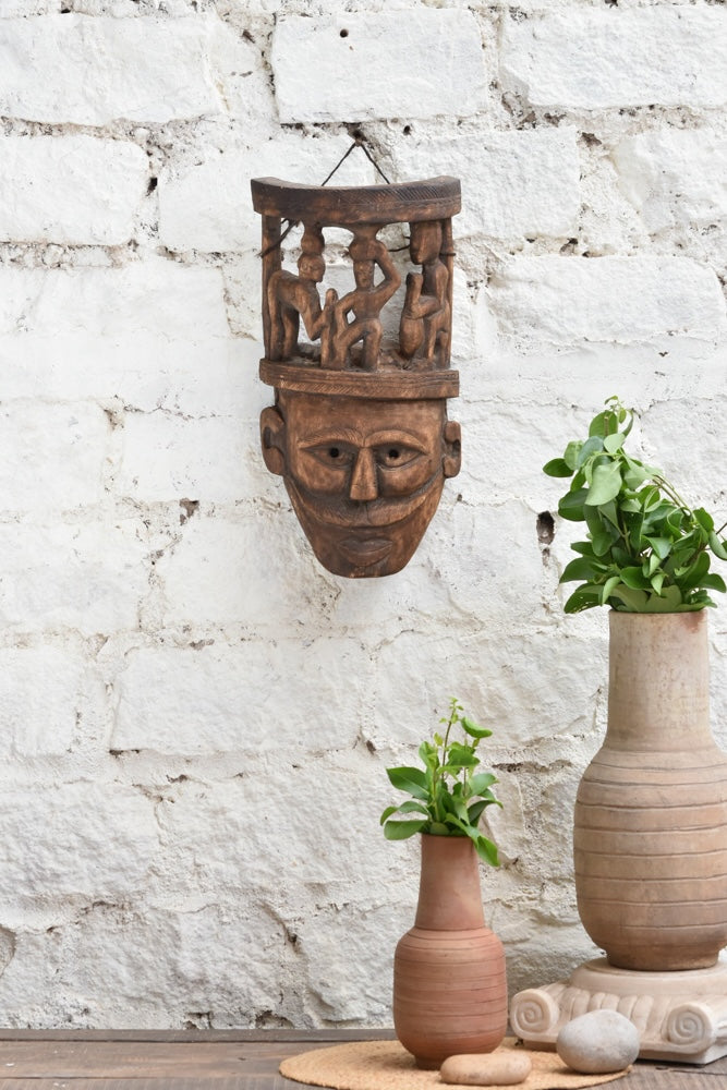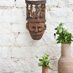 This intricately carved wooden mask features a striking scene atop the head, capturing glimpses of everyday village life, perhaps a nod to community, rhythm, and resilience. Each miniature figure is hand-carved from reclaimed wood, making this not just a mask, but a narrative sculpture. The bold facial structure and deeply etched eyes command attention while the crown tells stories of labour, tradition, and celebration. It's a stunning fusion of functional folk art and cultural memory. Ideal for walls that seek a voice, a past, and a presence.