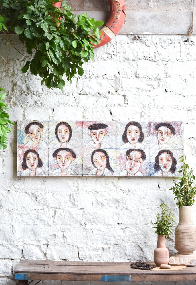 Ten faces, ten stories. This evocative piece captures the unspoken emotions that dwell beneath the surface. With its layered textures and soft hues, Whispers Within invites you to pause, reflect, and connect with the subtle expressions of being human.