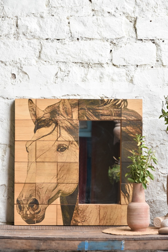 Crafted from individually placed wooden tiles, this mirror is framed by the powerful gaze of a hand-painted horse, its mane flowing like wild wind across the grain. The artwork captures not just the animal’s beauty, but its unyielding spirit and silent strength. One side reflects the world, while the other speaks of freedom. A striking blend of utility and art, perfect for homes that admire wilderness, movement, and soul.