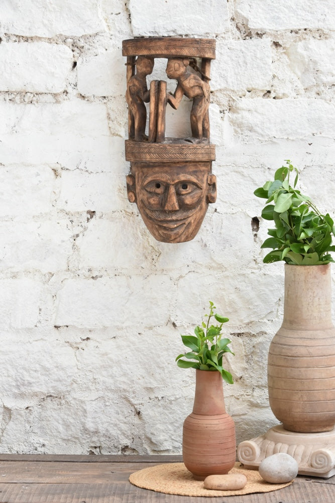 This captivating wooden wall art features a hand-carved tribal mask topped with two figures in a storytelling pose, an ode to ancestral wisdom and community lore. Each detail is chiselled with care, reflecting traditional craftsmanship and a raw, earthy aesthetic. The expressive facial features and tactile textures bring a sense of life and legacy to your space. Perfect as a statement piece, it adds cultural depth and rustic character to modern interiors. This is not just decor, it's a timeless echo of heritage passed down through skilled hands.