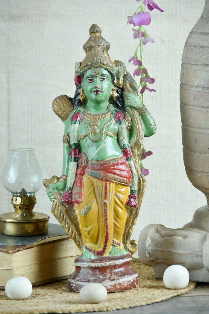 Uniquely painted in green tones with yellow attire, this variant of Lord Rama reflects the regional and folk interpretations of his divine persona. Holding his bow and arrows, the idol captures his readiness to protect dharma and his people. The hand-painted strokes highlight cultural artistry and individuality. Compact and full of character, it serves beautifully as both a devotional figure and a collectable. Each imperfection adds to its authenticity.