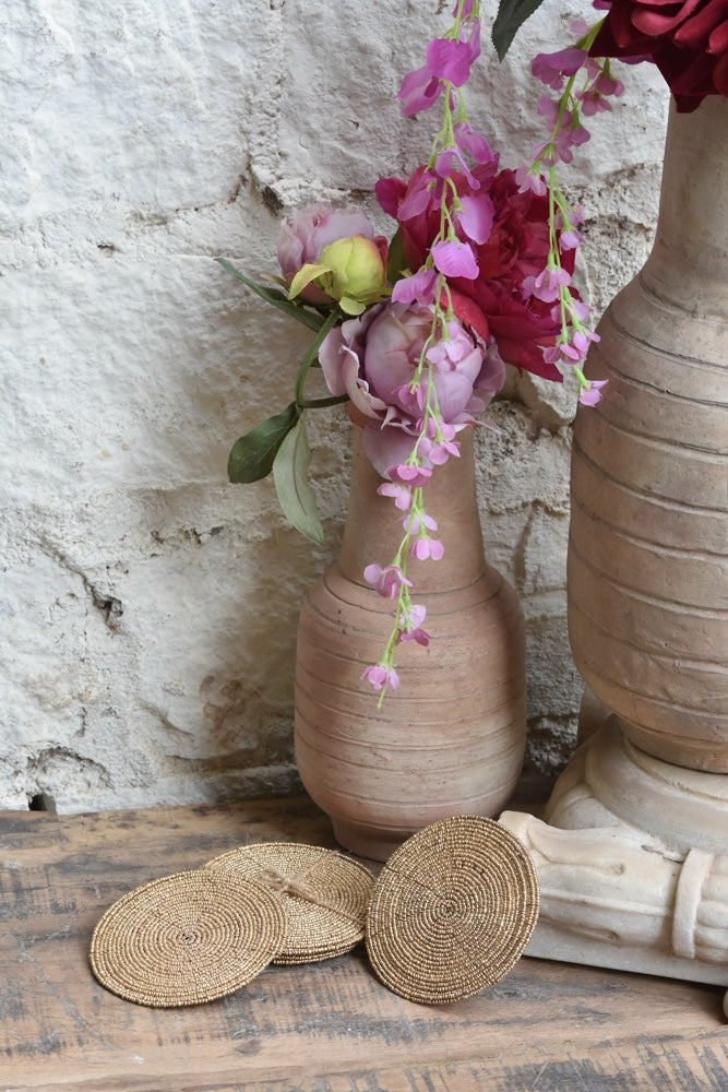 Elevate your table setting with this stunning set of six handcrafted coasters. Each piece is intricately designed with golden beaded detailing, creating a warm, artisanal charm that blends effortlessly with both modern and rustic décor. Beyond their beauty, these coasters protect your surfaces with style, making them perfect for daily use or special gatherings. It's a thoughtful addition to your home or a delightful gift for someone who appreciates fine craftsmanship.