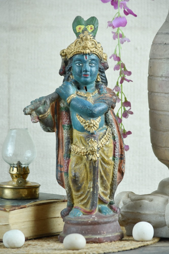 This idol presents Lord Krishna in his darker, traditional blue form, adorned in golden drapery and ornate detailing. The figure exudes calmness while holding the flute, a reminder of his universal call of love and harmony. The aged finish gives it a rustic, vintage appeal. Its size makes it versatile for shelves, pooja rooms, or thematic décor corners. A piece that bridges folk tradition with divine storytelling.