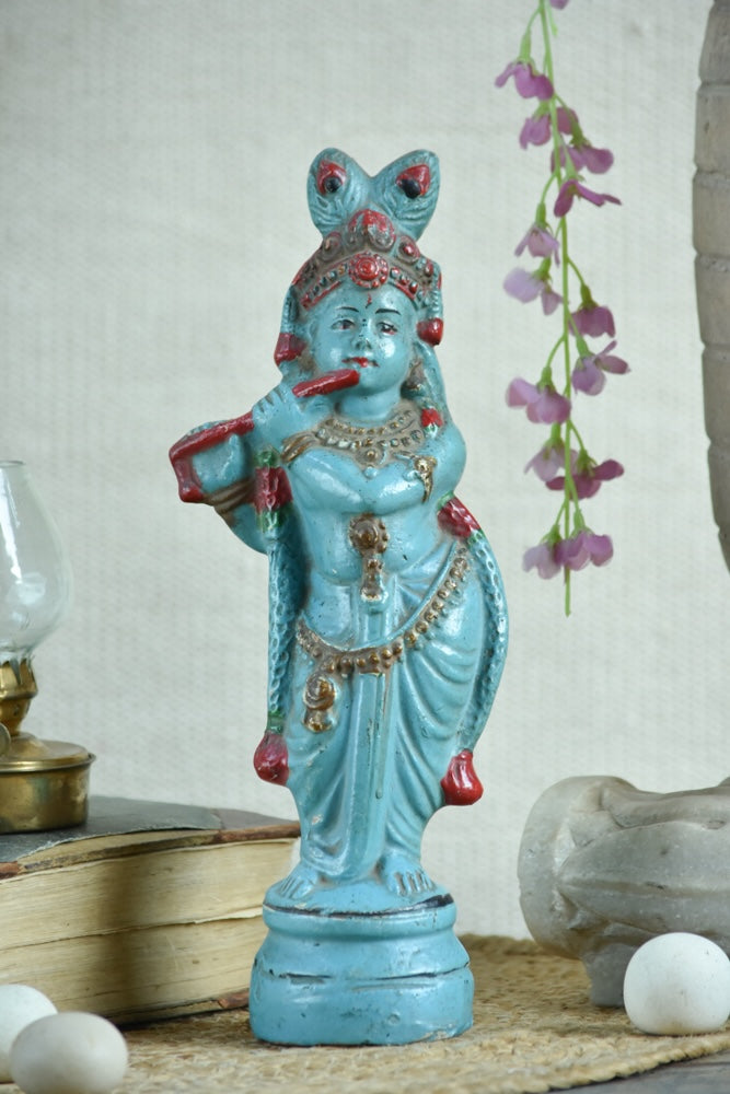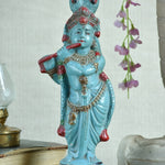 Draped in vibrant turquoise, Krishna is depicted with his flute and the iconic mor pankh (peacock feather) adorning his crown. The feather symbolises beauty, immortality, and divine love, while his flute spreads joy and harmony. This idol embodies playfulness and devotion, making it perfect for puja rooms or as a soulful accent for your living space.