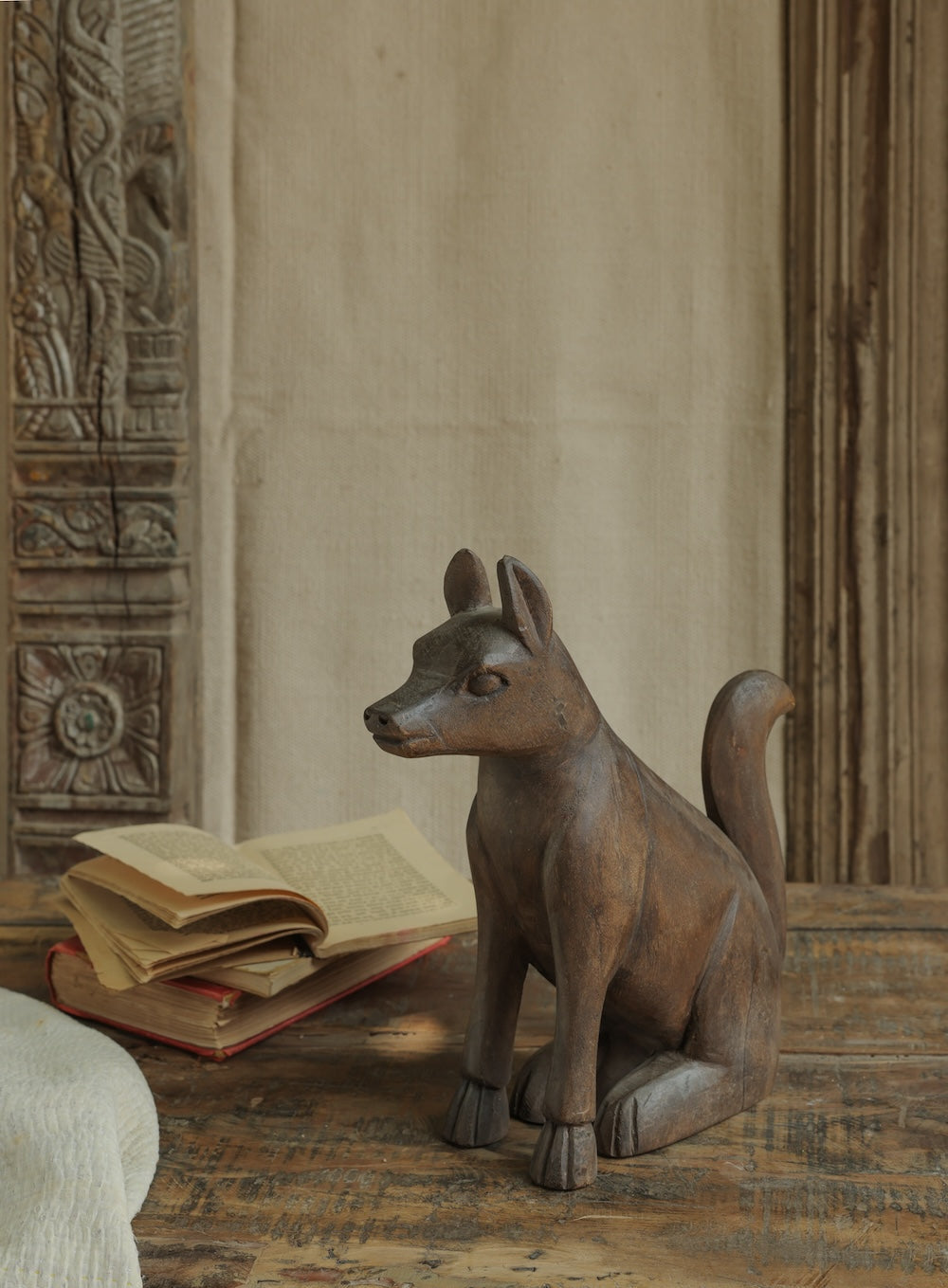 Crafted from reclaimed wood, this wooden dog enhances aesthetic appeal while promoting sustainability. Perfect for a living room corner, it features a beautiful brown patina and a modern clean finish. Its natural imperfections, like cracks and fissures, add to its unique charm, showcasing creativity and environmental awareness. The wood's history and age further accentuate its beauty. In Vastu, keeping a dog decor at home symbolizes loyalty and enhances familial bonds, spreading an aura of love among family members.