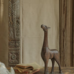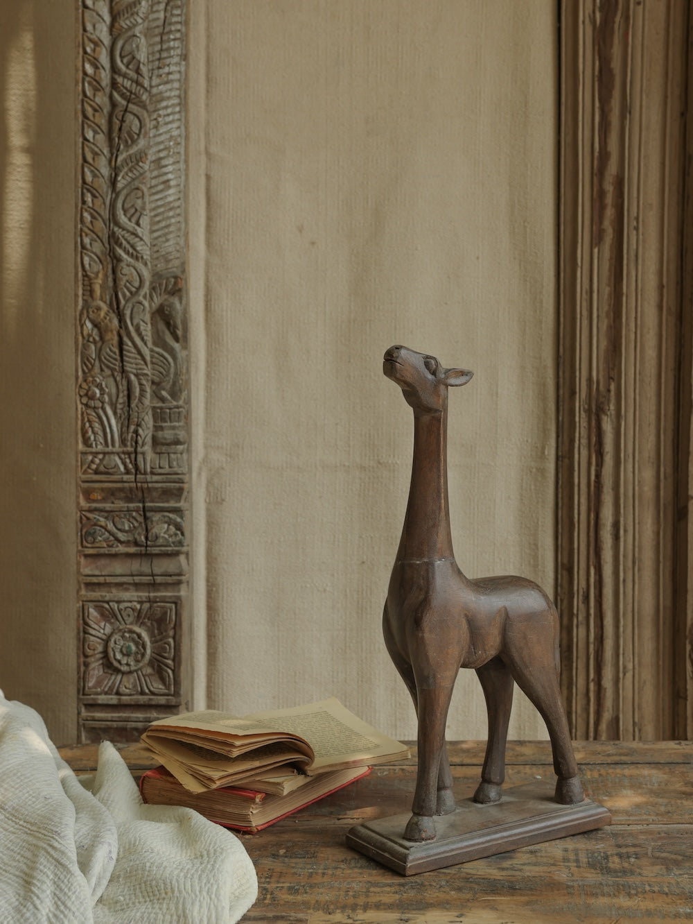 Crafted from reclaimed wood, this wooden giraffe enhances aesthetic beauty and promotes sustainability. Ideal for a living room corner, it features a beautiful black patina and a clean modern finish. Its natural imperfections, like cracks and fissures, add to its unique appeal, highlighting a blend of creativity and environmental awareness. Reflecting both historical charm and age, this piece is not just decorative but also considered auspicious in Vastu, symbolizing protection and foresight.